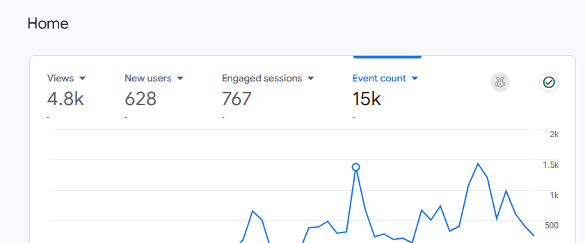 4.8K Views, 628 New Users, 787 Engaged Sessions and 15K Event Count. through Google Analytics.